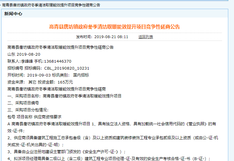 【公告】2019年高青縣唐坊鎮政府冬季清潔取暖能效提升項目