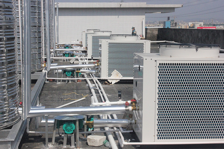 水箱和機組安裝在樓頂,冷熱水管在路面與客戶水管對接。熱泵熱水系統主要由熱泵熱水機組,不銹鋼保溫水箱、循環系統、補水系統、控制系統和管道配件組成。主機安裝正旭熱水機組,儲熱水箱連接熱水管路通向各個用水點。其采用強制循環定溫放水,熱水箱儲水方式,運行穩定。同時,整個系統控制采用智能化控制,24小時準確進行水溫、水位檢測,保證系統安全穩定運行,實現無人管理。