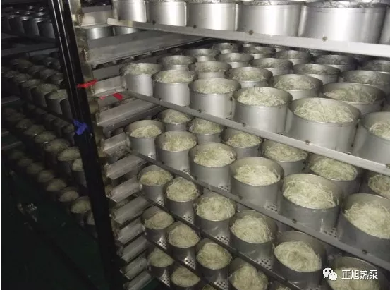 3、蒸粉后再進行擠絲:米漿經過高溫蒸粉處理后,凝固成粉皮,方可進行擠絲工序。通常選擇不同的孔徑型號,擠絲后粉皮變身為米線,粗細不一樣,口感不一樣。然后又將米線在100℃—105℃的蒸籠內蒸上3-5分鐘,以確保米線的熟透程度,并確保米線衛生干凈無菌。
