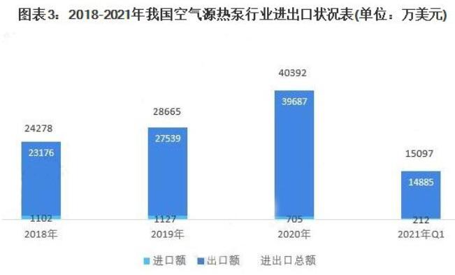 海關數據顯示,2020年中國空氣源熱泵行業產品進出口總額為4.04億美元,同比增長40.91%;其中進口額為705萬美元,同比降低37.44%;出口額為3.97億美元,同比增長44.12%;實現貿易順差3.90億美元,同比增長47.59%。2020年我國空氣源熱泵行業的貿易順差進一步拉大,表明我國國內產品的競爭力進一步加強,同時受益于國內疫情控制良好,較快復工復產,競爭優勢明顯。