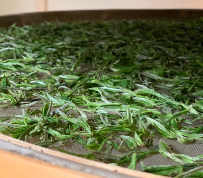 當白茶凋萎葉達到九成干時,采用烘干機烘干,進風口溫度設置在70-80攝氏度之間,攤葉厚度4厘米左右,歷時20分鐘就足以干燥。七八成的凋萎葉需要分兩次烘焙,第一次烘干溫度設置在90-100攝氏度,攤葉厚度4厘米,烘干10分鐘。第一次烘干后需要進行攤放,使水分分布均勻。第二次烘干溫度設置在80-90攝氏度之間,烘干20分鐘就足夠,烘干后的白茶含水量控制在5%以內。