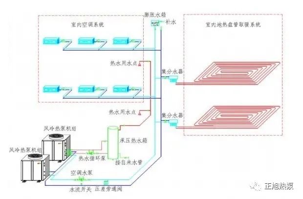 首先我們要了解什么是空氣源熱泵采暖。空氣源熱泵采暖是指空氣源熱泵+采暖末端(地暖、暖氣片等)+水管、閥門等輔件組成的一套取暖系統(tǒng)。這套取暖系統(tǒng)的核心是空氣源熱泵主機(jī),空氣源熱泵工作時利用少量電能驅(qū)動熱泵運(yùn)行,吸收空氣中的低溫?zé)崃坎⒃鰷貕嚎s成高溫?zé)崮埽偻ㄟ^換熱器將高溫?zé)崮芙粨Q到冷水中,將冷水升溫,之后利用水管,將熱水輸送到室內(nèi),通過采暖末端為室內(nèi)提供溫度和熱水。