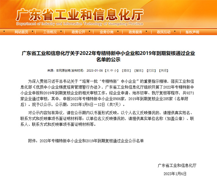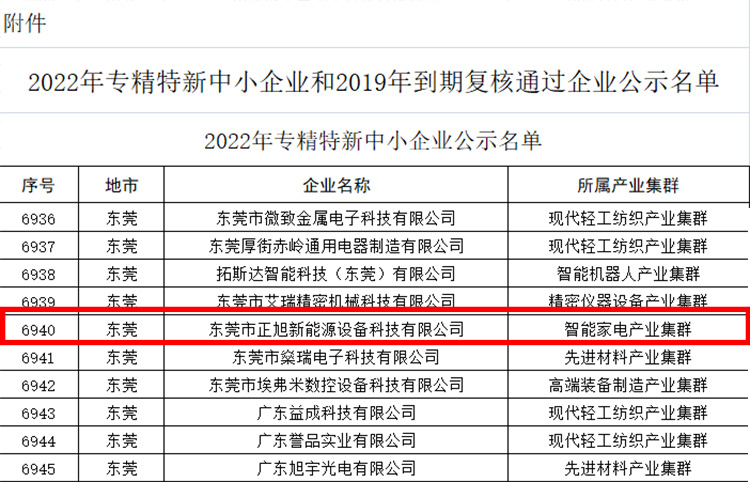 為深入貫徹習近平總書記關于“培育一批‘專精特新’中小企業(yè)”的重要指示精神,落實工業(yè)和信息化部《優(yōu)質中小企業(yè)梯度培育管理暫行辦法》,廣東省工業(yè)和信息化廳日前發(fā)布2022年專精特新中小企業(yè)和2019年到期復核通過企業(yè)名單公示(http://gdii.gd.gov.cn/zwgk/tzgg1011/content/post_4077221.html),東莞市正旭新能源設備科技有限公司順利通過2022年專精特新中小企業(yè)申報審核并進入公示名單。