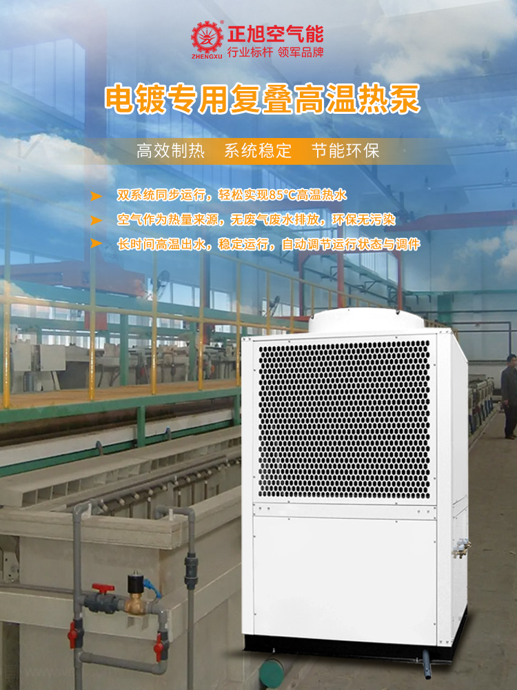 正旭電鍍高溫熱泵技術相比傳統電鍍加熱方式來說,無廢氣污染,無可燃燒排放物、無有毒氣體排放、保持環境清潔等優點;而且該產品采用特殊高效環保冷媒,換熱效率高,相比傳統電鍍加熱方式更高效更節能,全年運行總費用僅相當于電加熱四分之一,燃油加熱的三分之一,燃媒鍋爐的二分之一;與此同時,正旭高溫熱泵并可通過獨立研發的智能控制系統保持恒溫,保證產品的鍍制質量。總結來講,正旭電鍍高溫熱泵具有以下五大特點: